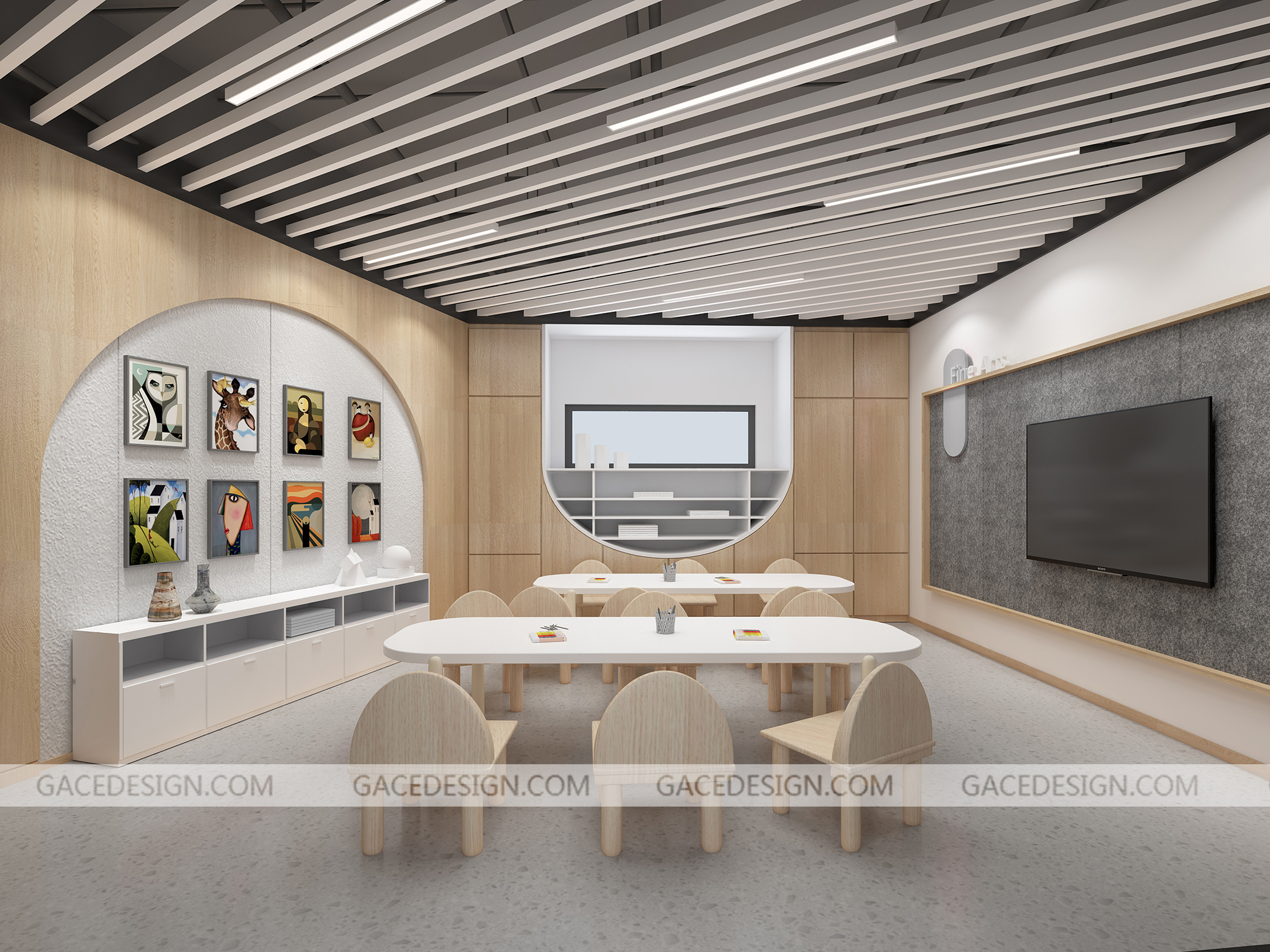 設計說明:美術不是為了讓孩子成為一個畫家,而是培養他們對美的認識。現在的孩子離藝術太遠了。對于美學的培養不只是孩子在繪畫的過程中,它是一個潛移默化的過程。這次我們以「孩子身邊的藝術館」為主體。讓藝術走進孩子的生活。我們將設計作為一個整體的建筑群和社群進行考慮。一個內向空間的美術展覽廳模式。它延續著我們關注的試驗方向:在內部重新劃分內與外的秩序,并以一種抽象和藝術的方式介入。