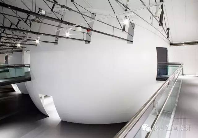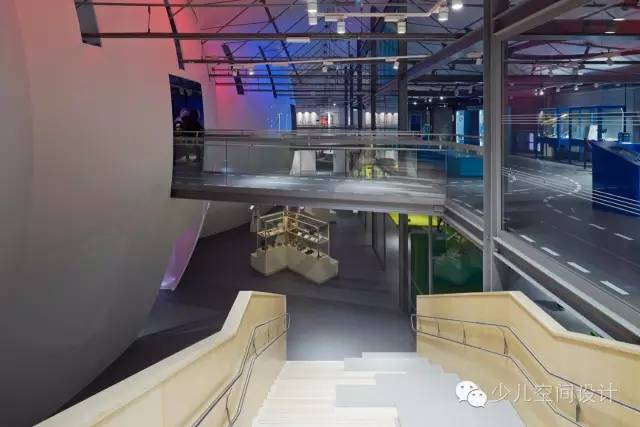 在大廳里,兩個宏大體量較天花板又上升了10米,一個體量繃緊而堅硬,另一個體量柔軟而具有波動性。它們由橋梁相連,人們通過橋梁來回走動。游客會產生“哇”的驚嘆感,并被引入充滿誘惑和想象力的迷人世界,它激發(fā)人們的欲望和好奇心來參與學習、探索和創(chuàng)造的過程。