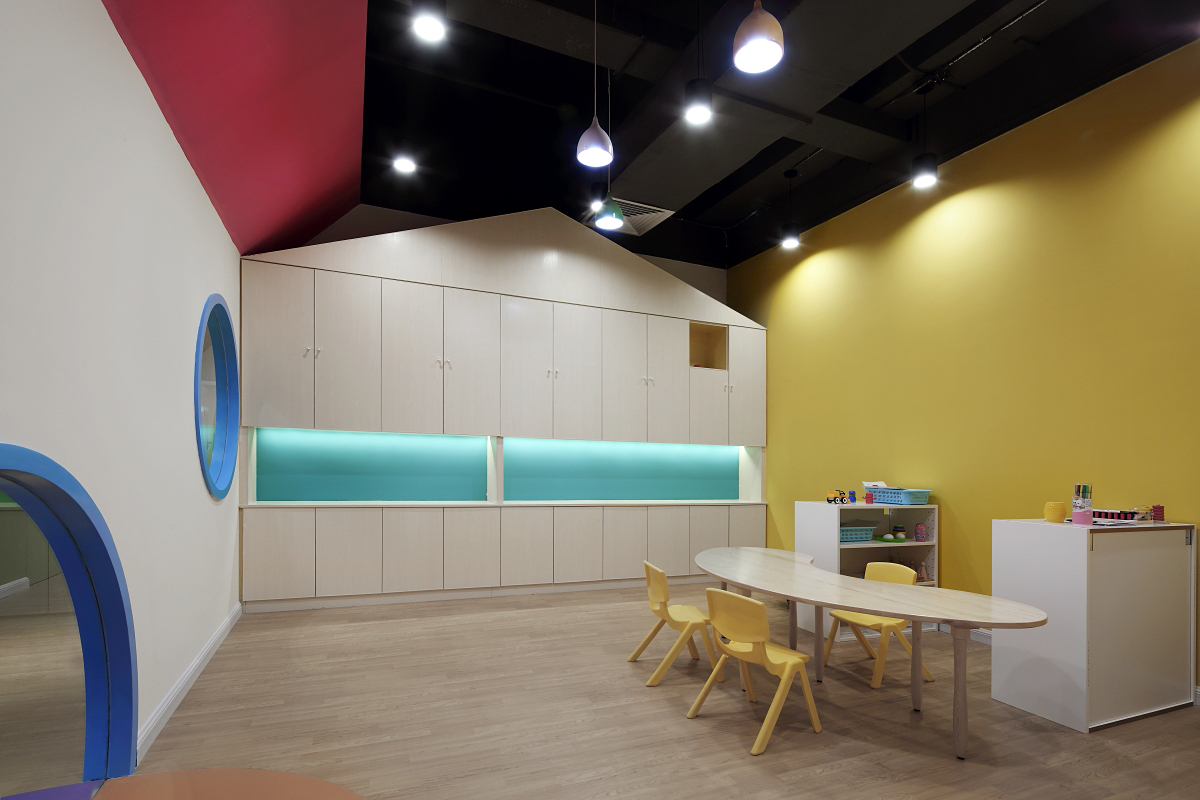 墻盡量少,多用玻璃窗。窗戶盡可能大,窗臺盡可能矮。墻裙盡量低,多在1250px以下。外墻可以直接采取落地玻璃,擴大采光和兒童視野。門要通透。但至少有一塊大面積墻,做主題展示用;同時也增強幼兒的安全感。